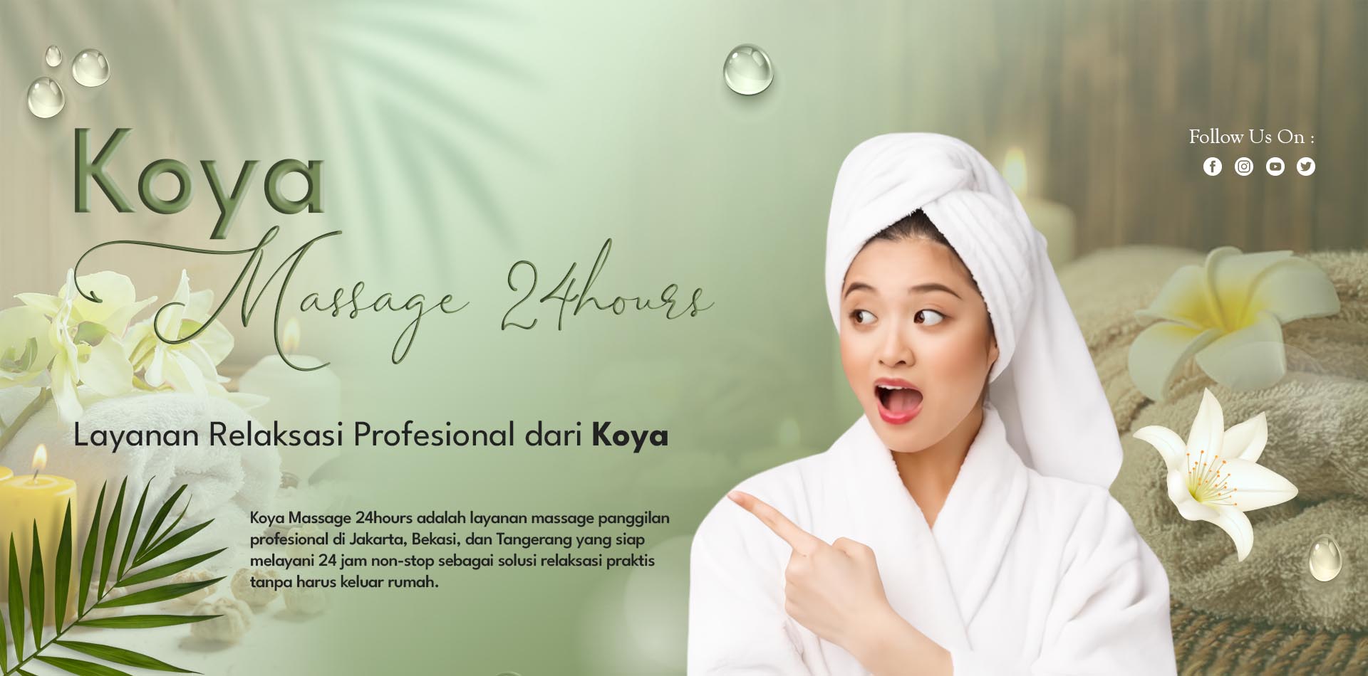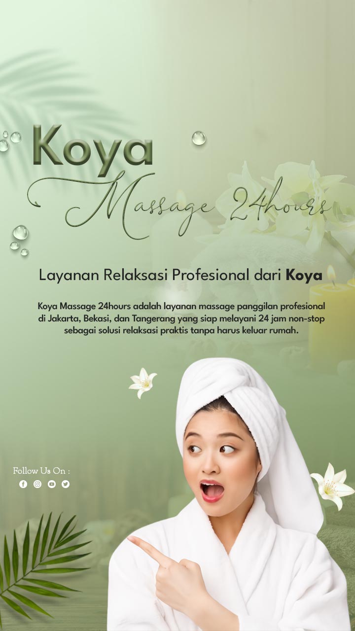 Koya Massage 24hours adalah layanan massage panggilan profesional yang siap melayani Anda kapan saja dan di mana saja di wilayah Jakarta, Bekasi, dan Tangerang. Dengan konsep 24 jam non-stop, kami hadir sebagai solusi praktis bagi Anda yang membutuhkan relaksasi tubuh tanpa harus keluar rumah.